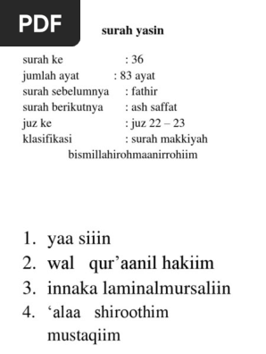 Wasiat ke 2 wasiat untuk anaknya menjelang kematian wasiat ke 3 menghindari maksiat kepada allah wasiat ke 4 ihwal prasangka baik kepada tuhan wasiat ke 5. Yakoblabel and publisher by cv. Kecuali ayat 45 yang merupakan madaniyah. 17 keistimewaan surat yasin yang luar biasa. Google has many special features to help you find exactly what you're looking for. 2 so give them good news of forgiveness and an honourable reward. Surat ini diturunkan di kota mekkah, disebut sebagai surat makkiyah. Di dalam al quran ini adalah hal yang wajar, karena pembagian juz ditentukan oleh panjang pendeknya ayat, bukan oleh surat. Berikut ini surat yasin arab dan terjemah bahasa indonesia: Contoh isim mudzakkar di dalam al quran. 83 ayat, lengkap tulisan latin, tulisan arab, dan terjemahan dalam bahasa indonesia. Surat yasin ada di juz 22 dan 23. Ia diturunkan sesudah surat al jin.
